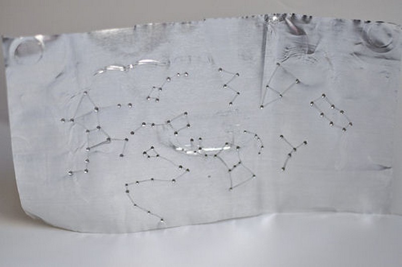 Step 2. Draw the constellations with a sharpie on the rectangle, and poke it with an awl to make the stars. The sharpie will make it possible for the kids to see the constellations more easily.