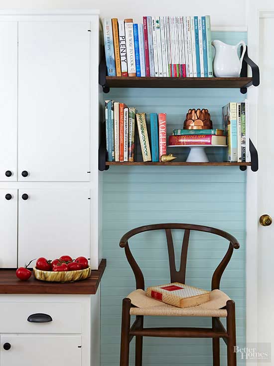 Shelves don’t need to be long expanses of horizontal space to be useful, especially in small spaces. Here, a narrow nook with narrow shelves yields a storage bonanza for cookbooks.